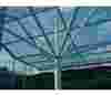 The structure shown above is the upper roof. This is the largest of the special structures with a width of approximately 35 metres and length of about 58 metres. The glass panels of the roof are supported on a system of pre-tensioned stainless steel rods and circular hollow section beams. These in turn are supported on steel tree structures as can be seen in the photograph.